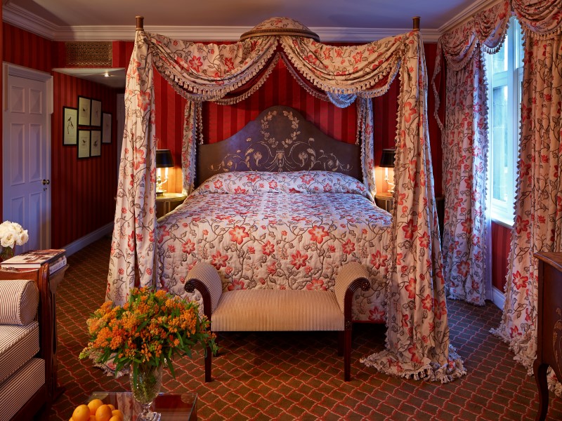 The room we have selected is the State Room that features a four poster bed, a separate dressing room and the large marble bathroom with double sinks, free standing bath, and separate shower overlook the lake and woodland. A beautiful, full of tradition room.